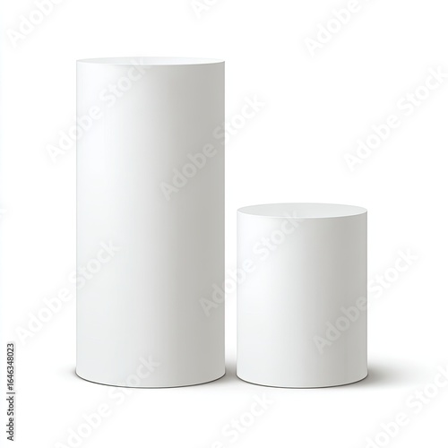 Two white cylindrical podiums of different heights against a white background