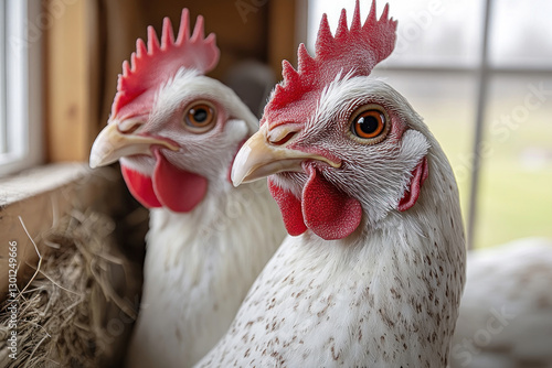 2, white, hen, red, comb, bright, orange, eye, they, inside, chicken, caged, next, window, natural, light, straw, seen, around, them, adding, warm, homelike, experiencing, look, well, groomed, clean, feather, healthy, indicating, kept, bird, pet, comb, beak, village, farm, agriculture, nature, bird, care, egg, cosiness, cleanliness, animal, wing, feather