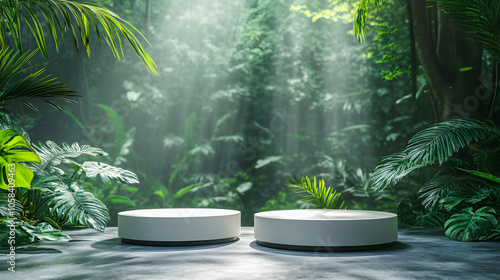 Two white round podium displays for product presentation, lush jungle forest in the background