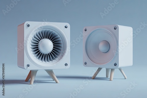 speaker, white, square, wooden, stand, light, blue, background, audio, sound, modern, minimalist, design, three-dimensional, render, studio, product, technology, digital, illustration, graphic, image, aesthetic, clean, simple, futuristic, portable, compact, small, stereo, pair, acoustic, woofer, tweeter, cylindrical, jet, fan, tech, furniture, object, rendering, minimal