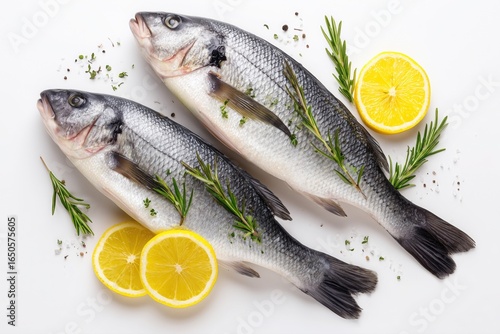 Two whole, fresh sea bass fish with lemon and herbs on a white background, top view. Concept of healthy eating.