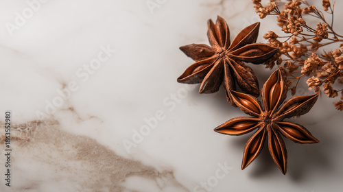 Two whole star anise pods and dried botanicals on an elegant marble surface, perfect for culinary and aromatherapy themes.
