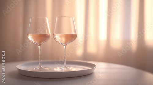 Two wine glasses are on a white plate, with a shadow cast on the plate