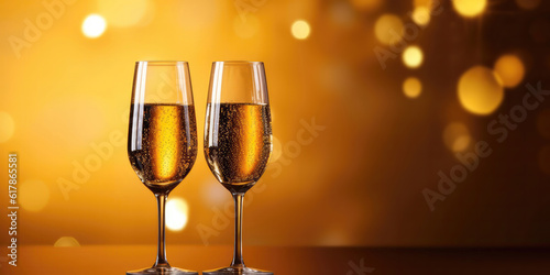 Two Wine Glasses On Yellow Background Of Fireworks With Empty Space. Celebrating Successful Work. Generative AI