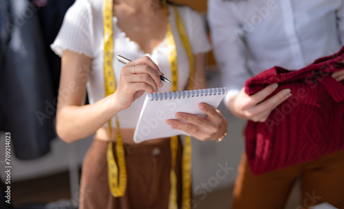 Two woman fashion designer cloth tailor creative working for new collection.