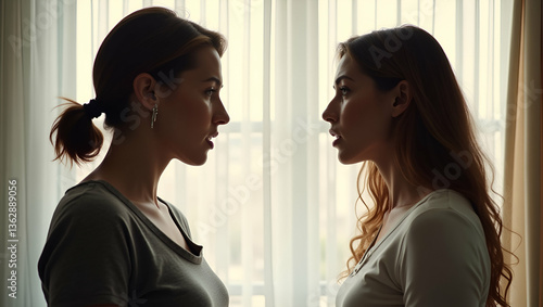 Two women arguing and distrusting each other illustrating conflict and relationship tension in personal dynamics concept as Two women arguing and showing distrust towards each other illustrating confl