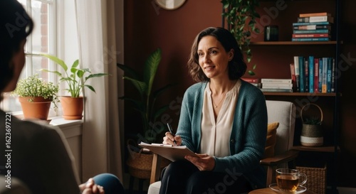 woman, therapy, counseling, consultation, patient, practitioner, session, listening, speaking, support, empathy, growth, healing, mental, health, well-being, communication, connection, care, advice, note, journal, document, compassion, understanding, professional, careful, focused, relaxation, comfort, warm, light, window, plant, home, interior, seated, adult, interview, discussion, learning, trust
