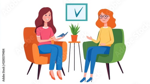 woman, conversation, talking, chair, armchair, indoor, room, bright, plant, potted, book, gesticulate, pixel, art, illustration, digital, friendly, communication, meeting, discussion, therapy, counseling, support, human relationships, friendship, female, casual attire, relaxed, calm, happy, smiling, positive, interior, home, office, simple, clean, modern, colourful, flat, design, vector, graphic, image, clip