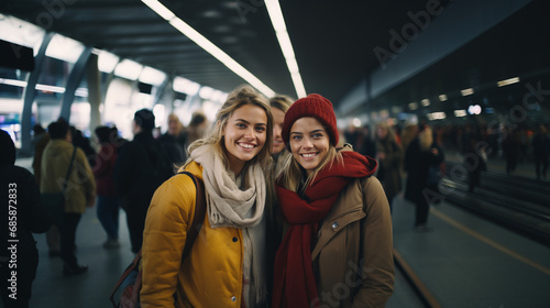 two women in busy train station wearing red scarves, smiling and posing; lively atmosphere, happiness, and camaraderie