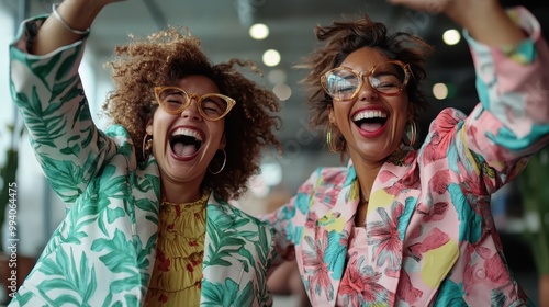 Two women in lively floral outfits express joy with bright smiles and dynamic poses, reflecting happiness, friendship, and the vibrant spirit of modern styles.