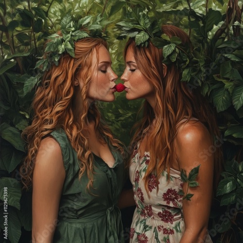 Two women sharing a raspberry in a lush, leafy setting, showcasing intimacy and connection in a vibrant green environment.