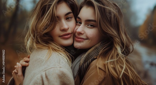 woman, friends, smiling, autumn, fall, wood, forest, leaf, nature, outdoors, friendship, happy, warm, clothes, foulard, tree, brown, yellow, orange, cold, close, hugs, together, joyful, love, happiness, season, picturesque, landscape, closeup, portrait, photo, beauty, natural