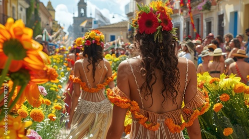Two women wearing flower headdresses walk down a street with a crowd of people