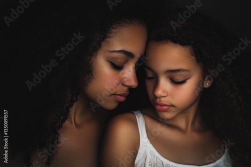 skin, face, eye, lip, hair, curly, dark, light, closeness, tenderness, emotion, beauty, portrait, young, together, affection, hugs, quiet, serene, close, sister, sibling, human relationships, intimate, warmth, shadow, detail, soft, natural, look, peace, calm, gentle, love, innocent, female, person, human, mother, daughter, touch, peaceful, support, connection, bond, side, profile