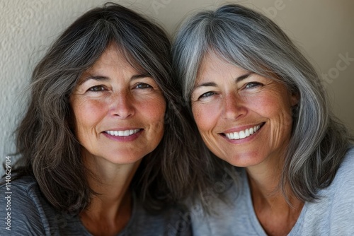 woman, grey hair, smiling, two people, middle-aged, portrait, closeup, head shot, caucasian, adult, female, friendly, happy, people, together, sister, twin, family, hair, face, skin, eye, teeth, casual attire, grey