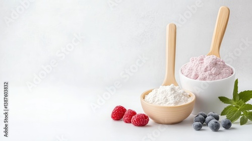 Two wooden bowls filled with colorful powders and fresh berries, minimalist white background, and natural and healthy ingredients concept.