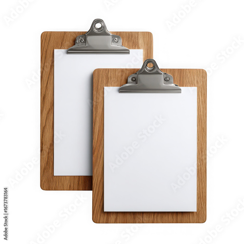 Two wooden clipboards with blank white paper sheets attached one slightly behind the other isolated on transparent background