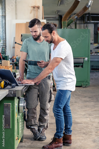 two worker in a carpenter's workshop with computer and clipboard
