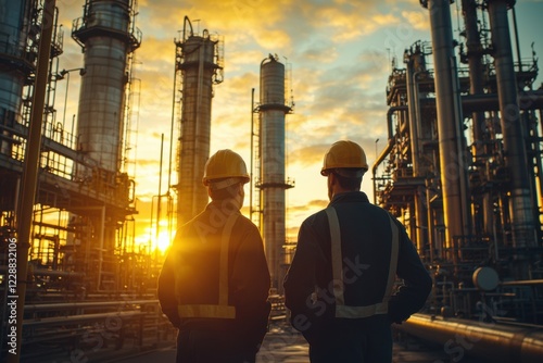 Two workers in hard hats stand in front of a sprawling industrial refinery, with the setting sun casting a golden glow over the scene