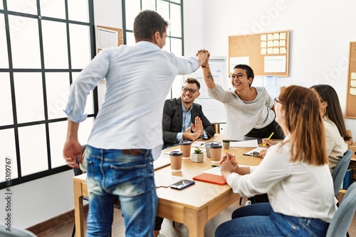 Two workers smiling happy high five during meeting at the office.