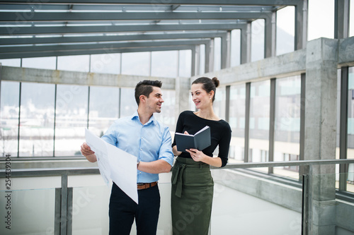 interior, inside, indoor, room, modern, people, adult, man, male, young, caucasian, workplace, workstation, business, office, corporate, work, businesswoman, portrait, copy, space, empty, blank, standing, attractive, architect, architecture, working, photogenic, building, design, project, professional, engineer, blueprint, laptop, computer, woman, female, colleague, talking, plan, notebook