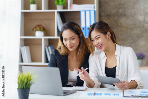 Two young Asian businesswomen discuss with new startup project Idea presentation, analyze planning and financial statistics and investment market on laptop computer at office.