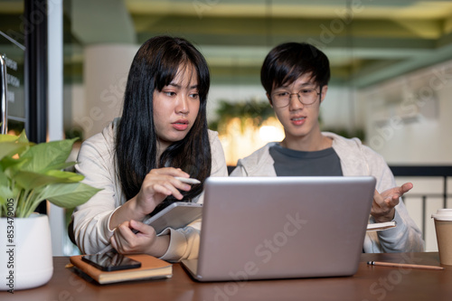 Two young Asian college student friends are working on a co-project together at a cafe.