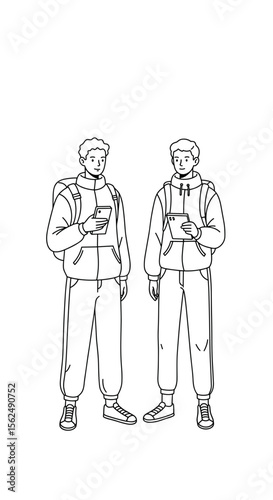 friends, young, chatting, phone, tablet, illustration, monochrome, casual attire, together, backpack, communication, technology, modern, style, engagement, youth, smiling, relaxed, minimalist, urban, connection, exploration, friendship, casual clothes, teamwork, bonding, togetherness, playful, happiness, creative, discovery