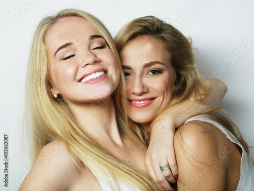 Two young girl friends standing together and having fun.