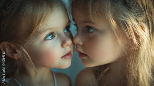 girl, intimacy, portrait, children, closeup, expression, light, beauty, innocence, emotion, sibling, friendship, love, connection, joy, happiness, youth, gaze, face, together, tender, natural, warmth, soft, moment, indoor, play, childhood, harmony, sweet, serene, playful, cute, smile, affection, bond, family, eye, close, charming, delightful, lovely, peaceful, endearing, enchanting, captivating, heartwarming, magical