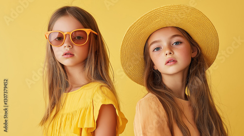 young, girl, wearing, yellow, clothing, hat, sunglasses, person, summer, background, childhood, children, little, 2, caucasian, beauty, cute, portrait, sister, friends, female, blue, pretty, fashion, holiday, lifestyle, children, dress, resort, positive, face, attractive, family, funny, white, blond, expression, model, outdoors, human, concept, friendship, park, hand, studio, bright, blurred, blur