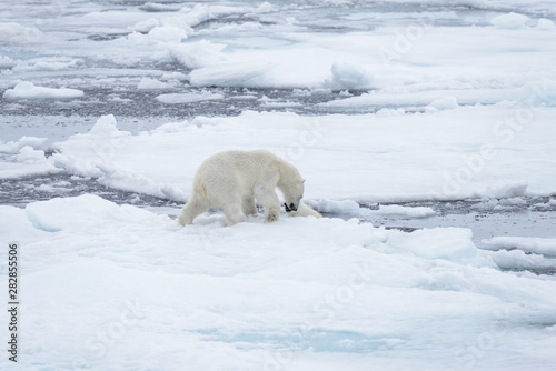 Two young wild polar bears playing on pack ice in Arctic sea, north of Svalbard