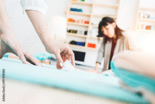 Two young woman tailor working at studio with different tailoring tools. Dressmaker making new clothing. Seamstress and her hand close up in workshop. Blurred background
