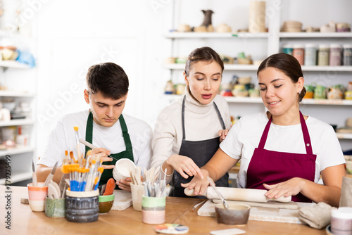 Two young women and young man sculpt pottery in workshop