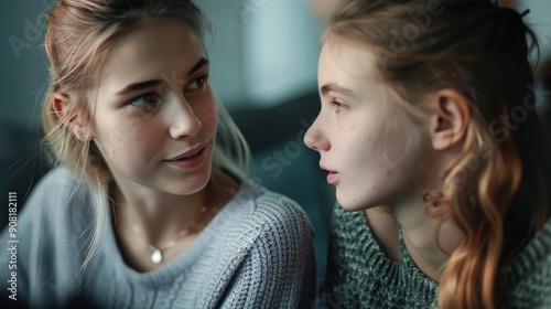 Two Young Women in Close Conversation, Close-up Portrait, Indoor Setting, Friendship, Teenage, Girls