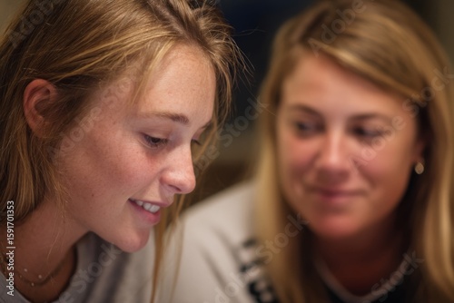 woman, portrait, closeup, friendship, smiling, happy, blonde hair, freckle, connection, communication, together, youth, beauty, human relationships, intimate, casual attire, natural light, daytime, indoor, soft focus, blurred background, joy, conversation, two people, looking down, friendly, skin, face, half face, sharing, candid, lifestyle, genuine, serene, peaceful, close, understanding, bond, support
