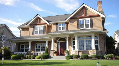Two-story house with beige siding, brown accents, white columns, and a stone facade at the base. Landscaped lawn and shrubs surround the home. A dark-red front door is visible.