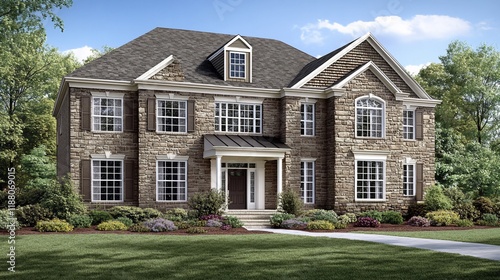 house, home, real estate, architecture, building, property, residential, dwelling, exterior, facades, stone, brick, window, roof, garden, landscaping, lawn, yard, tree, plant, flower, pathway, driveway, front, design, style, luxury, elegant, modern, roomy, comfortable, family, dream, suburban, neighbourhood, estate, construction, homeownership, investment, market, sale, buy, sell, living, lifestyle, american, traditional, classic