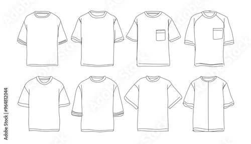 Types of t-shirts. Line drawing of T-shirt vector template set mock up isolated on white background. flat technical drawing template. Unisex T-Shirt illustration, T-shirt Mock-up.