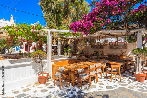 Typical Greek small restaurant on street in beautiful Mykonos town, Cyclades islands, Greece