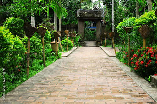 typical south east asian garden with lush vegetation with an old gate and torches along the pavement