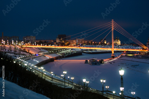 Tyumen, Russia, December 27, 2020: Pedestrian bridge on the embankment at night, in winter