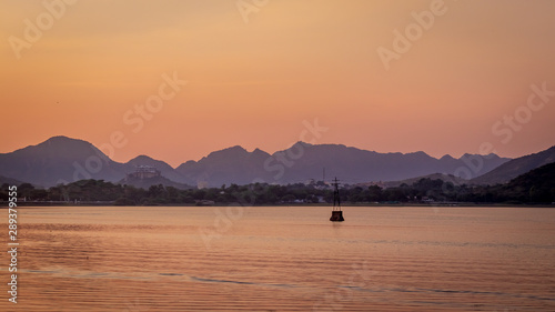sunset, sea, water, sky, sun, landscape, sunrise, nature, lake, boat, ocean, mountain, beach, beautiful, dusk, orange, dawn, cloud, mountain, evening, cloud, island, horizon, blue, silhouette, view, hotel