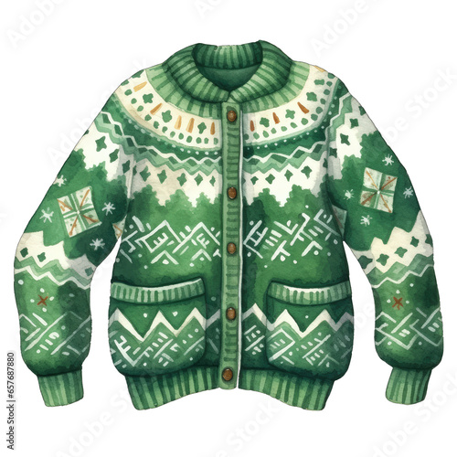 Ugly Christmas Sweater, green color tones, fair isle print. Isolated, transparent background