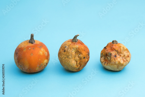 Ugly vegetables . three little pumpkins of varying degrees of corruption . light blue background.
