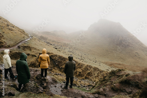 britain, scotland, isle, viewpoint, 4, woman, foggy, landscape, individuality, copy space, people, travel, adult, group, fog, weather, nature, scottish, highland, life events, holiday maker, traveler, recreation, observation, point, cool, hazy, simple, living, caucasian, rainy, dark, rural, togetherness, excursion, vacation, adventure, leisure, standing, hood, mountain, journey, bonding