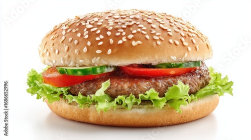 Ultra quality image of burger with sesame seed bun, isolated on white , fast-casual, classic.