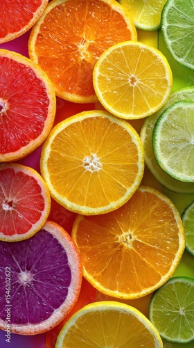 Ultra quality image of colorful background with citrus fruits, oranges and lemons, limes, rainbow-colored background, high resolution, high detail, vibrant colors.