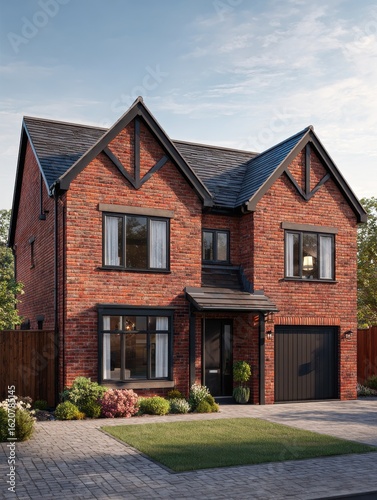 Ultra realistic exterior view of a contemporary british home with red brick and black roof design
