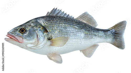 Ultra realistic HD sea bass fish silver scales realistic fins, isolated on white background